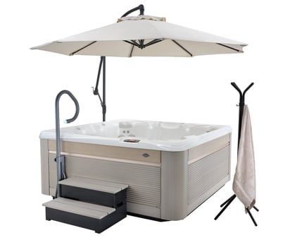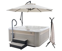 Parasol déporté, rampe latérale d'accès et de sécurité, porte serviette et peignoirs, marche d'accès, appuis têtes..